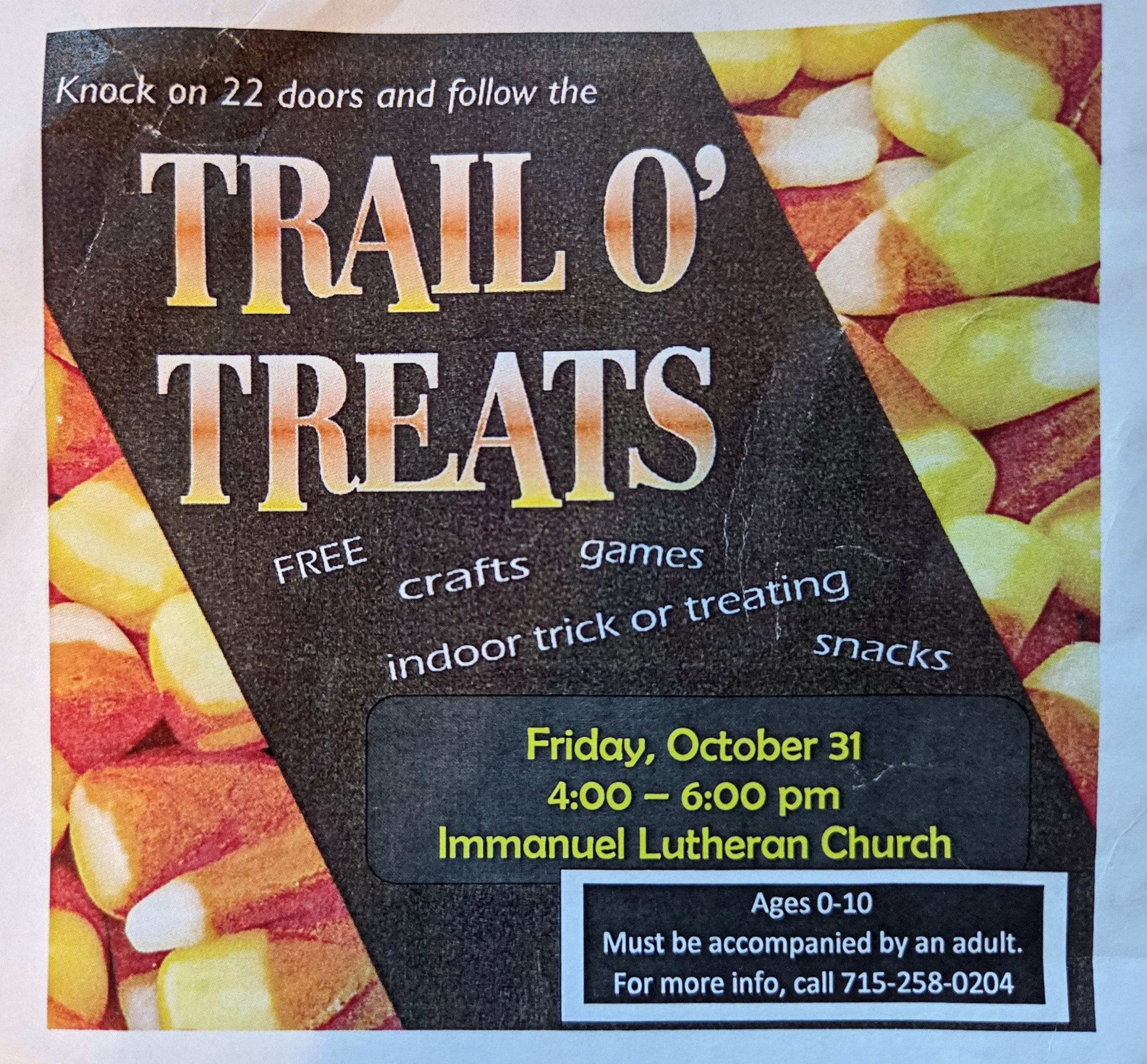 Friday, Oct. 31, 2025, 4:00-6:00 pm - Trail O' Treats.